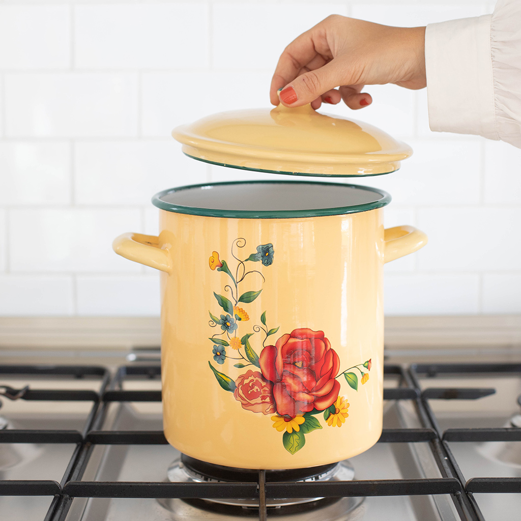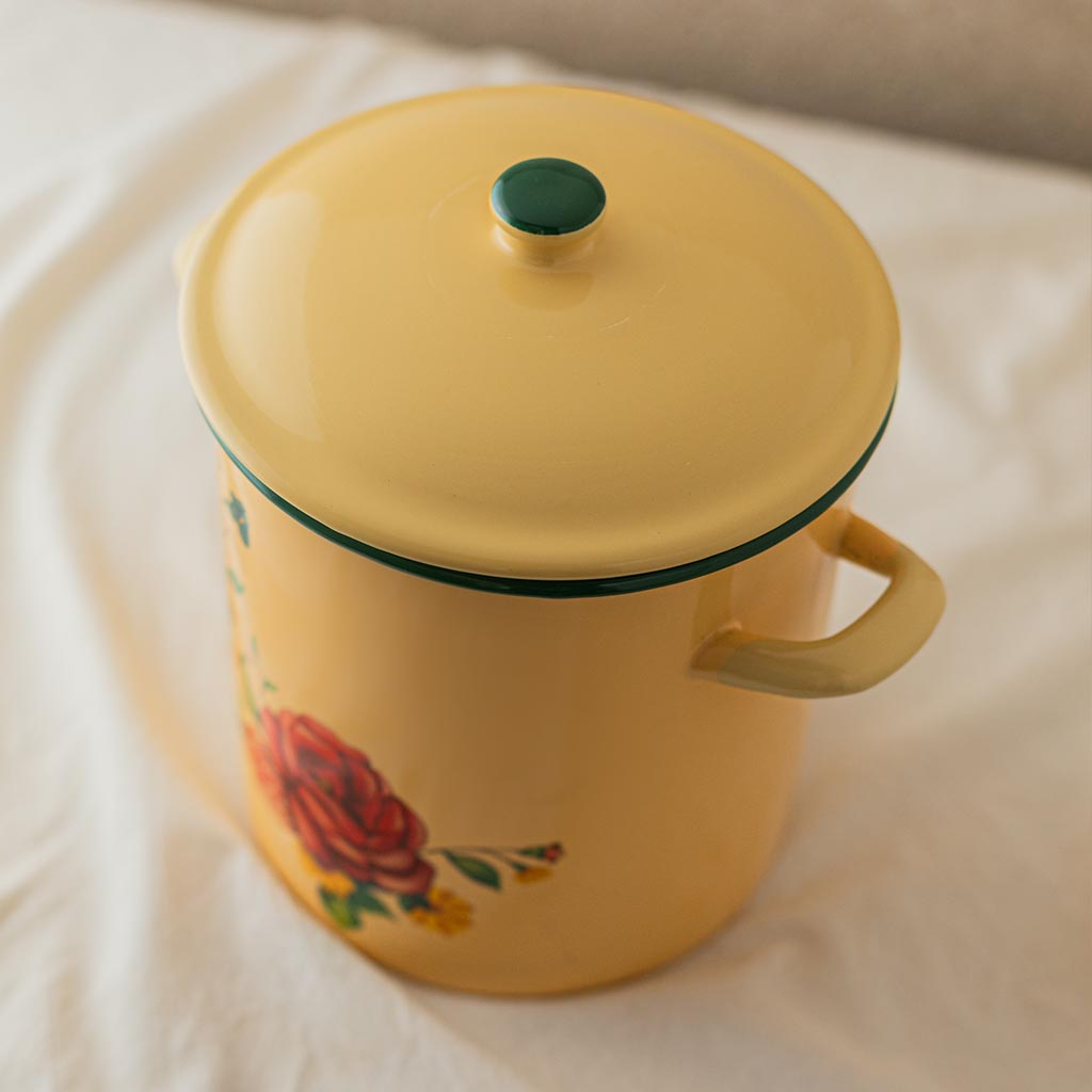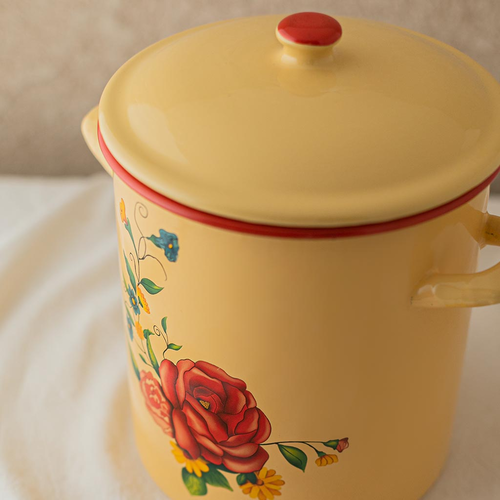 Olla guisera chica enlozada, con tapa y manijas. Base amarilla, estampa en lateral, borde de tapa en color verde o rojo.