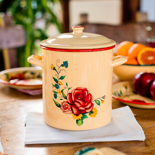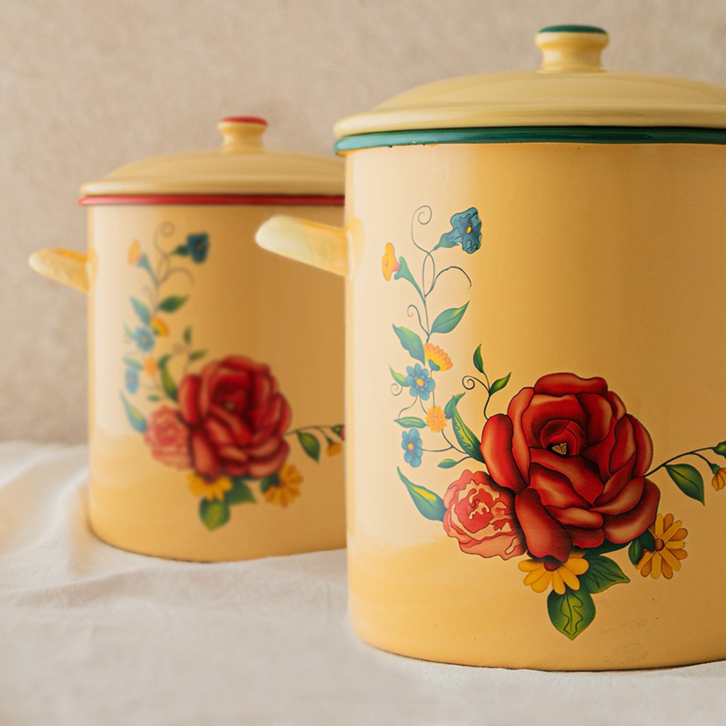 Combo de productos con 20% de descuento: 2 ollas borde verde + 2 ollas borde rojo, diseño rosas, colección Raíces.