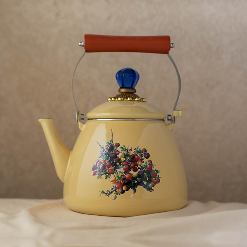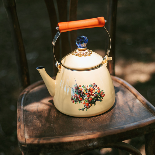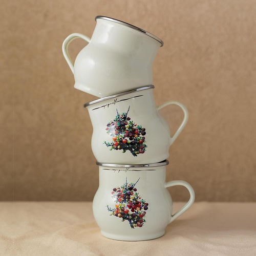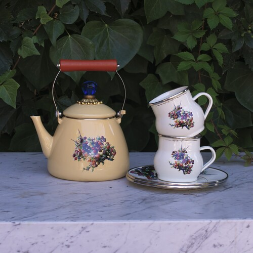 Combo de productos enlozados con 20% de descuento: 2 pavas + 6 tazones semibombé (blanco con virola de acero) diseño piquillín, colección raíces.