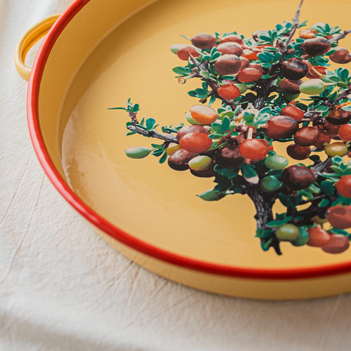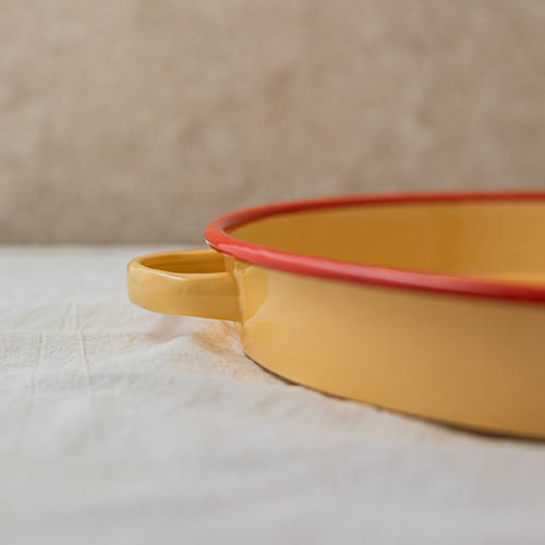 Fuente pizzera circular enlozada con manijas, base color amarillo con borde rojo.