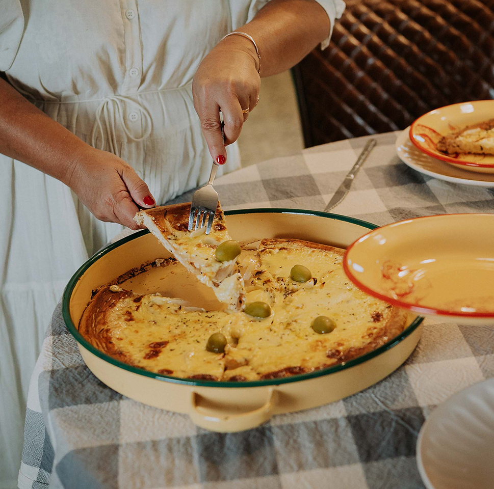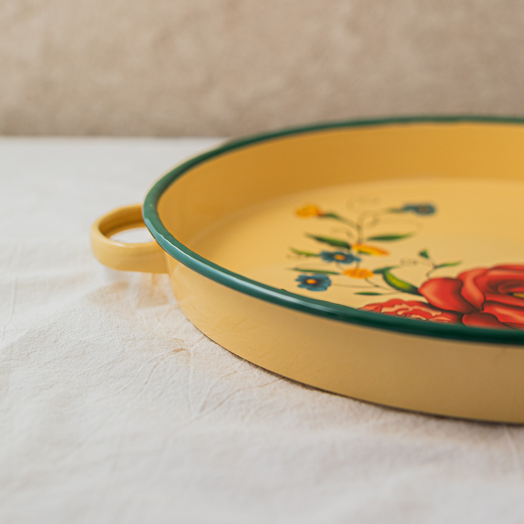 Fuente pizzera circular enlozada con manijas, base color amarillo con borde verde.