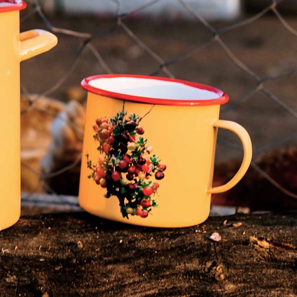 Hervidor enlozado con asa, estampa en lateral, borde rojo superior.