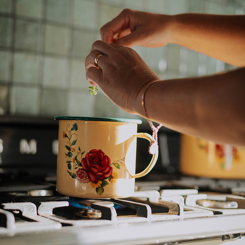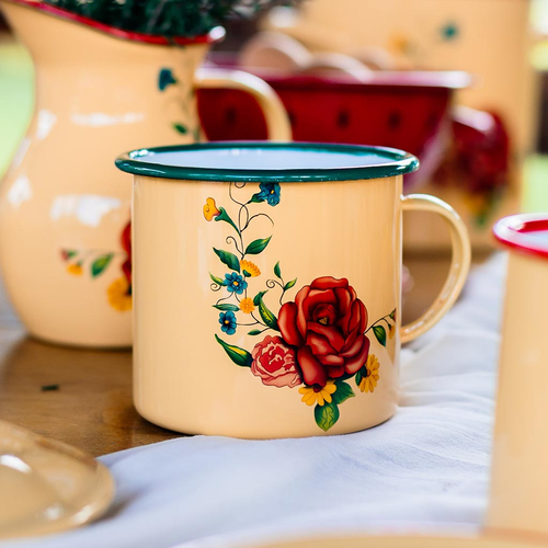 Hervidor enlozado con asa. Base amarilla, estampa en lateral, borde superior en color verde.