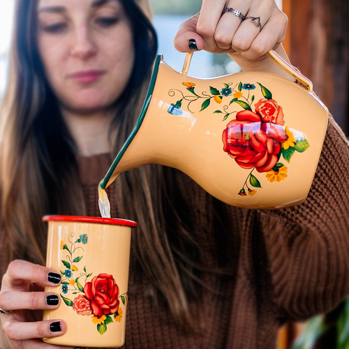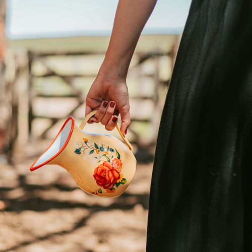 Jarra bombé enlozada, base amarilla con borde superior rojo.