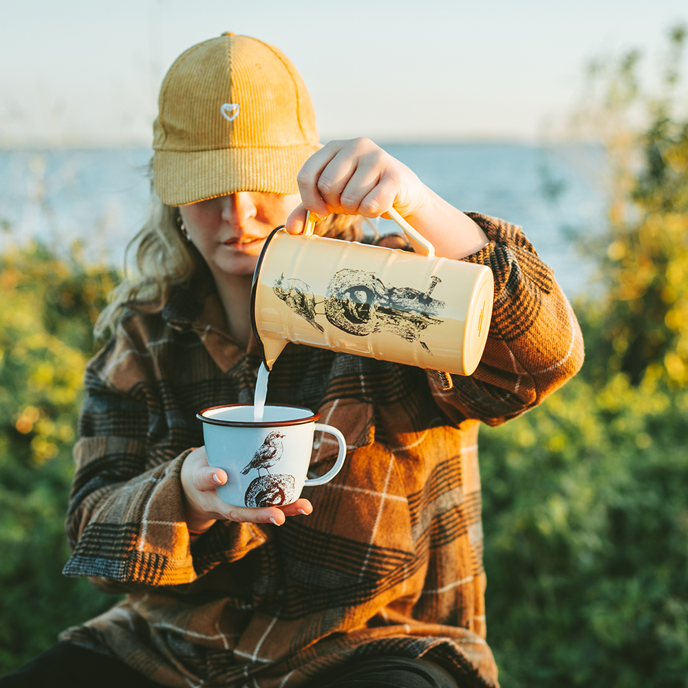 Jarra cilíndrica enlozada. Base amarilla, estampa y borde superior en color marrón.