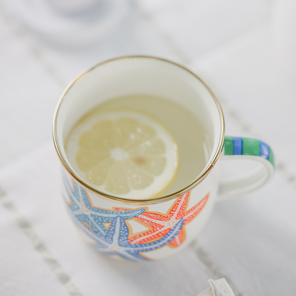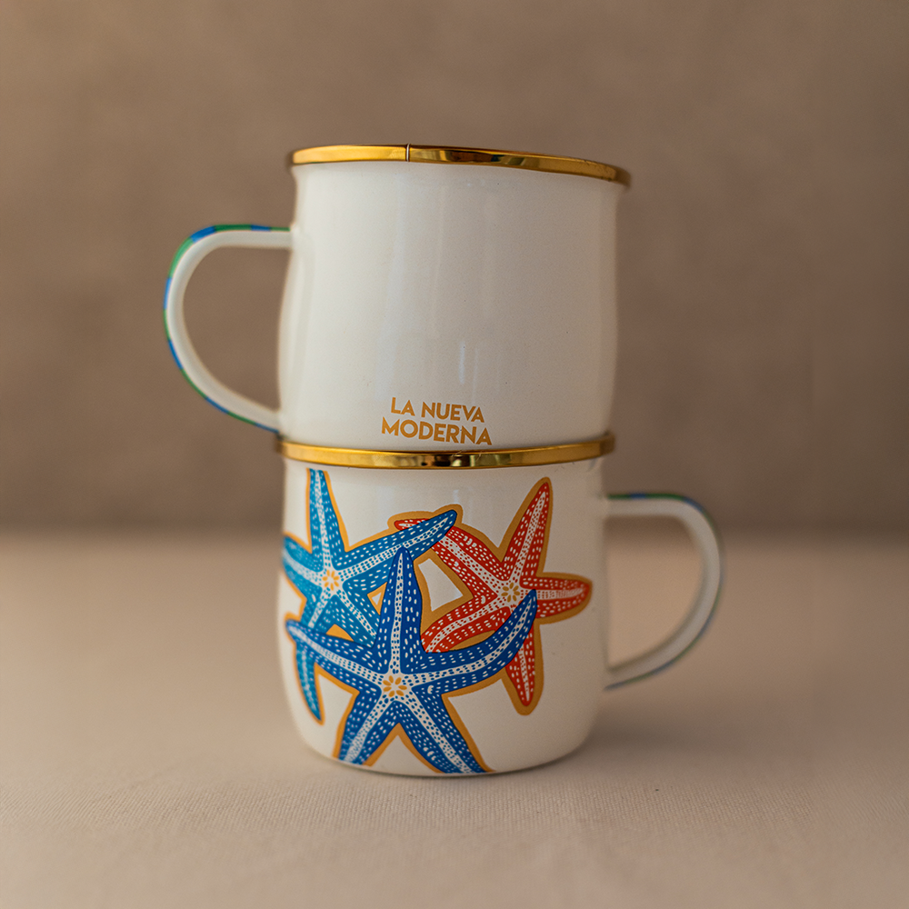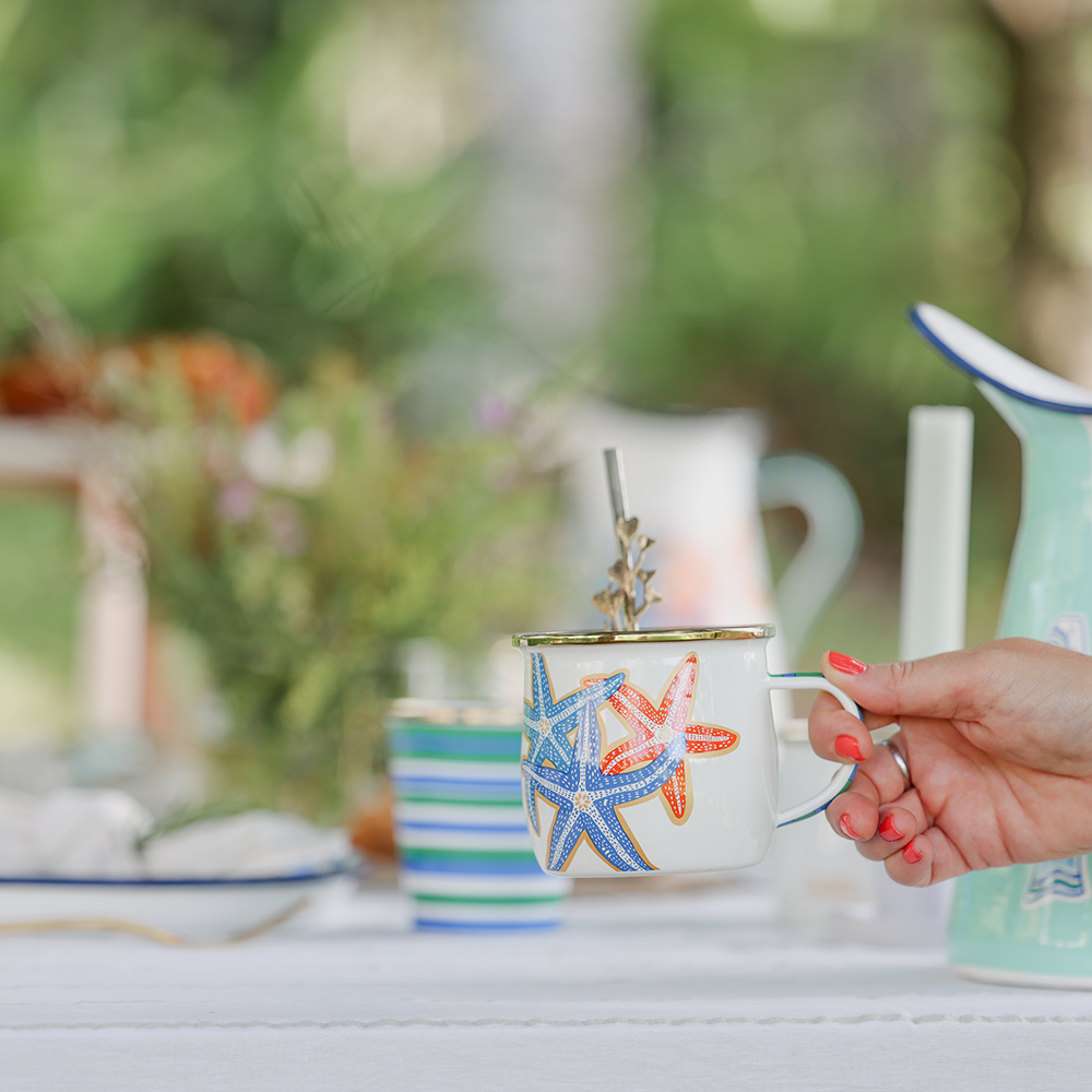 Jarrito taza con asa enlozado. Base blanca con estampa en lateral, virola de acero dorada.