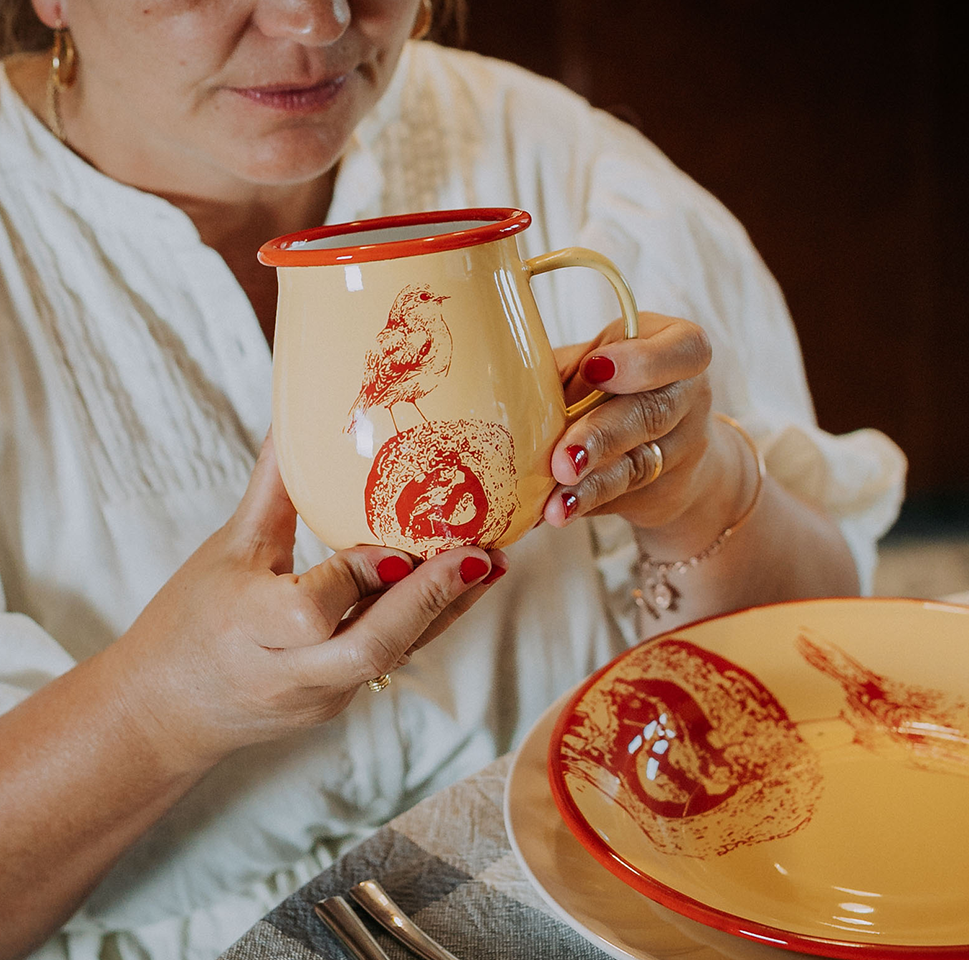 Plato principal enlozado. Base amarilla, estampa y borde en color rojo.
