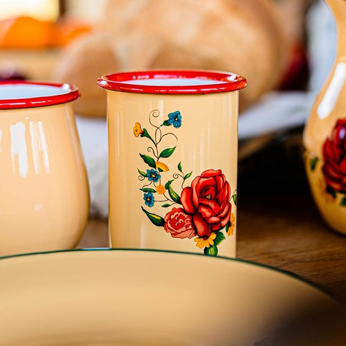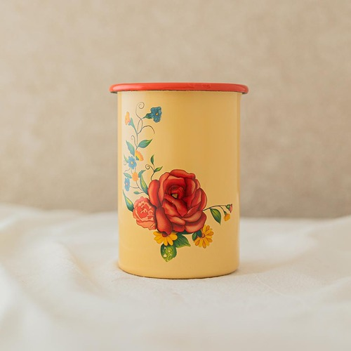 Vaso cilíndrico enlozado. Base amarilla, estampa en lateral, borde superior rojo.